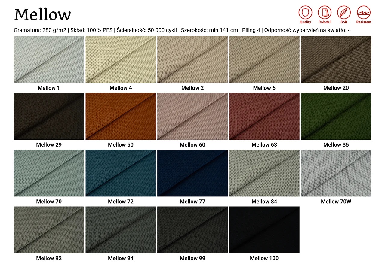 Tkanina Mellow to wyjątkowy materiał obiciowy, wyróżniający się wysoką jakością oraz bogatą gamą kolorystyczną, zapewniający nie tylko estetyczny wygląd, ale także wyjątkowy komfort użytkowania i trwałość. Doskonale nadaje się do tapicerowania sof, kanap, krzeseł i innych elementów wystroju wnętrz, dodając im elegancji i funkcjonalności.