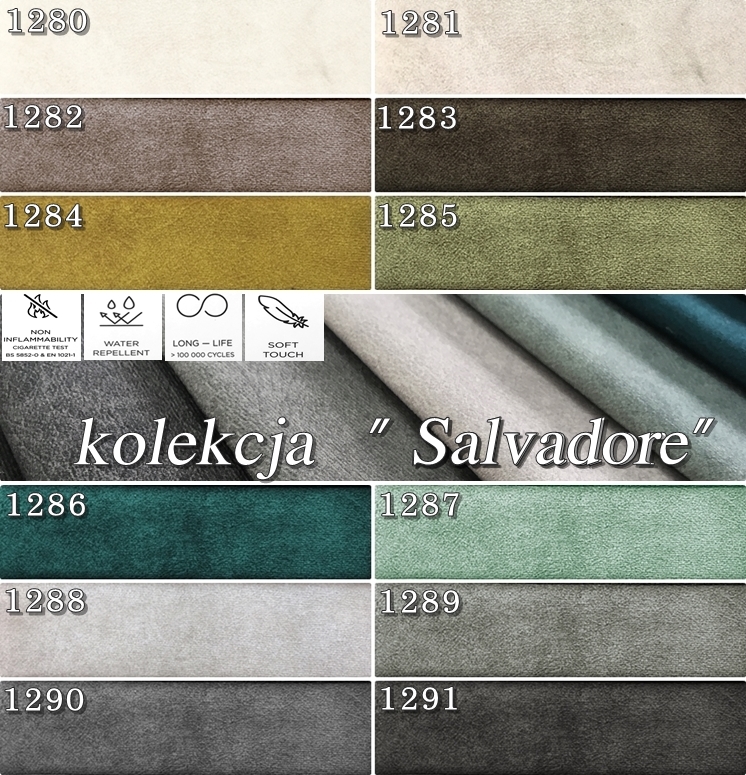 SALVADOR – tkanina meblowa, welurowa, miękka, ciepła i przyjemna w dotyku z delikatnie. Tkanina wyprodukowana w technologii ograniczającej wchłanianie cieczy, posiada również wysoką odporność na ścieranie. Materiał obiciowy o intensywnej barwie kolorystycznej idealnie sprawdza się na meblach tapicerowanych, także na poduszkach.